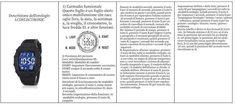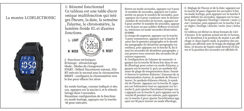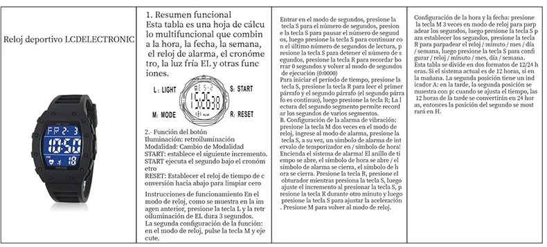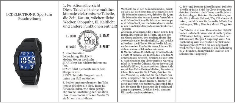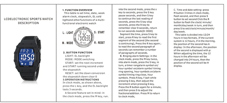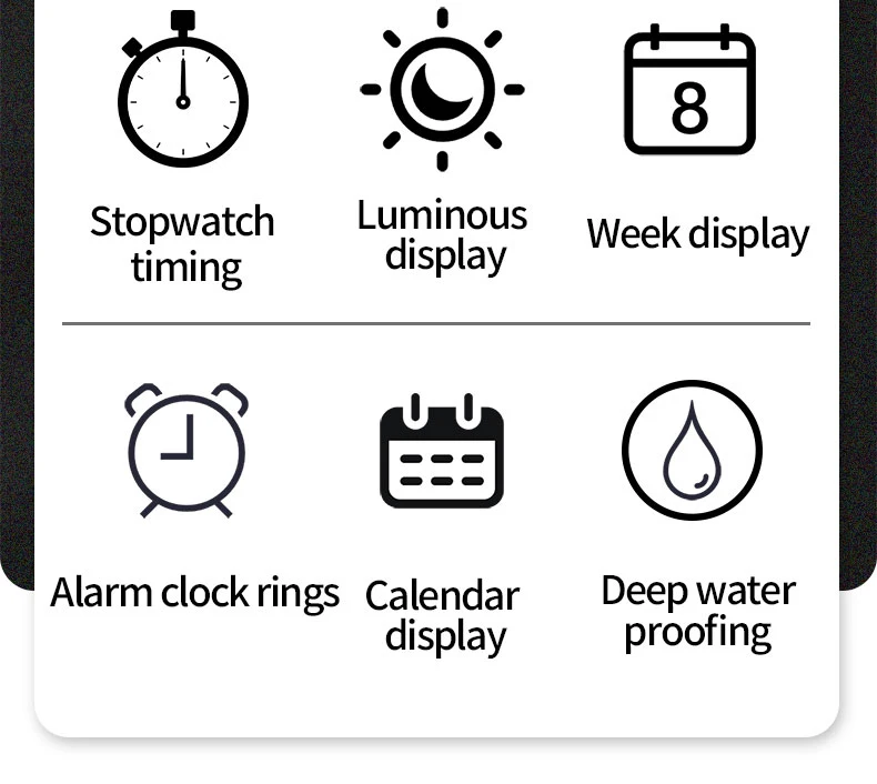 • Functions: waterproof, day display, alarm clock, luminous, automatic date display Waterproof, day display, alarm clock, luminous, automatic date display;