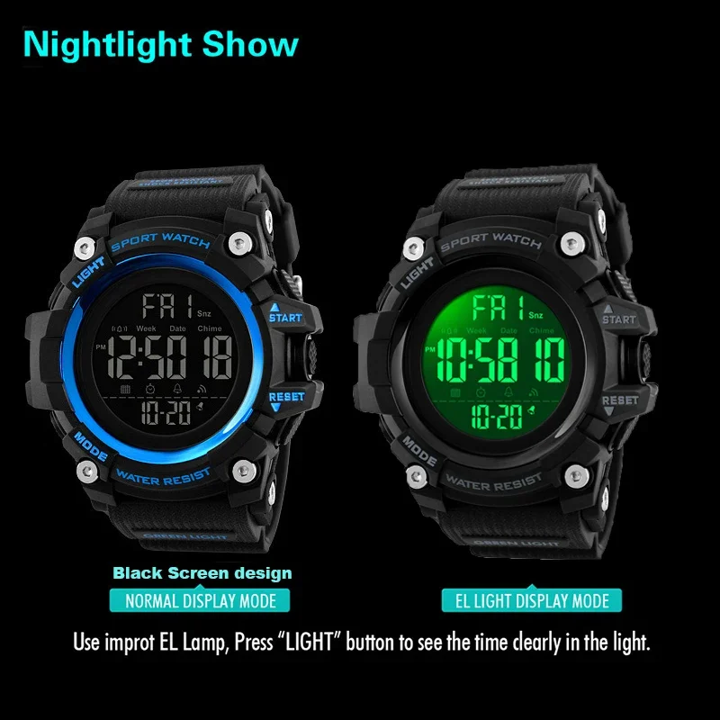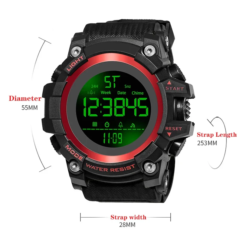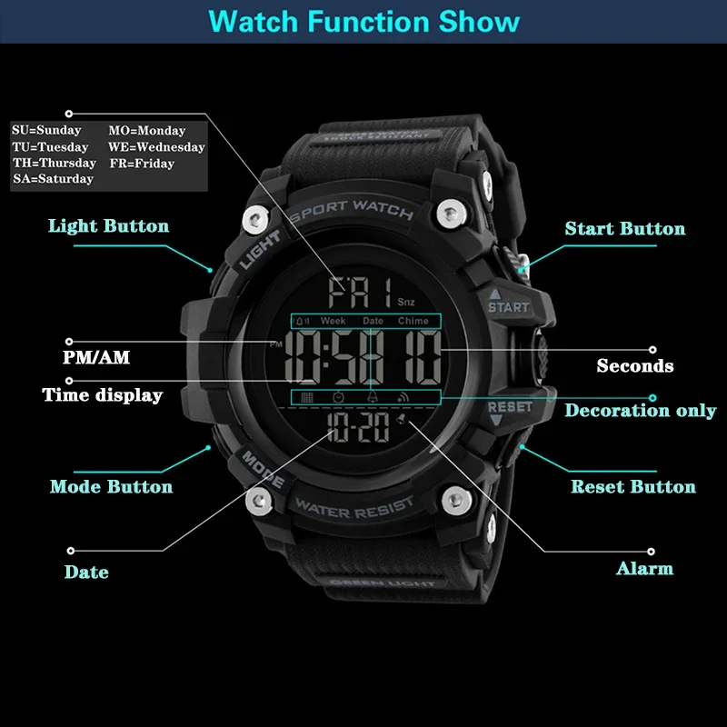 –Multi-function: display time,stopwatch,back light,Display the date,Display week,Timing alarm clock,12/24 hourly,waterproof,shock resistant,
